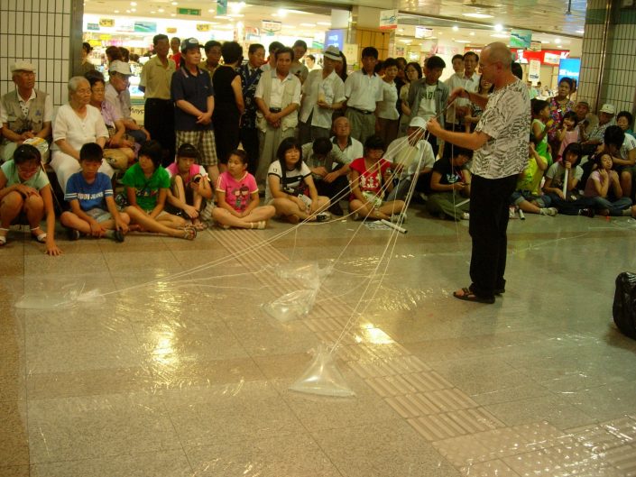 From a large black trash bag he pulls out nine plastic bags filled with water, closed by a ring that threads into the rope.