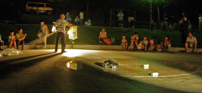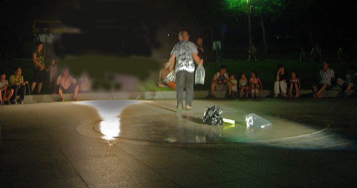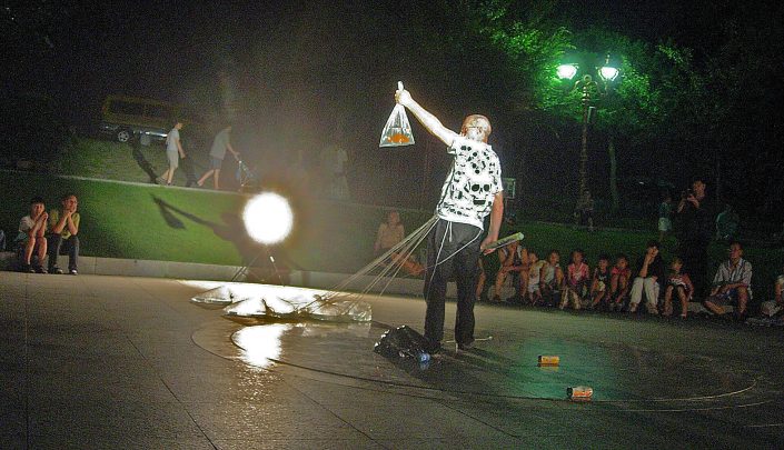From a large black trash bag he pulls out nine plastic bags filled with water, closed by a ring that threads into the rope.