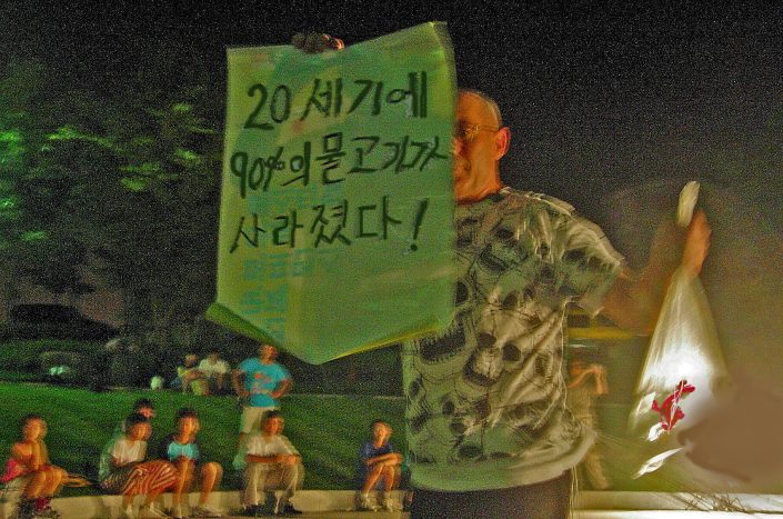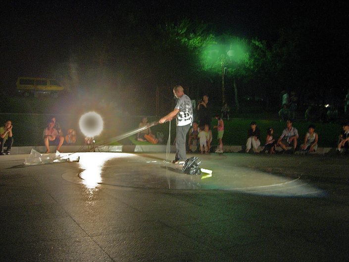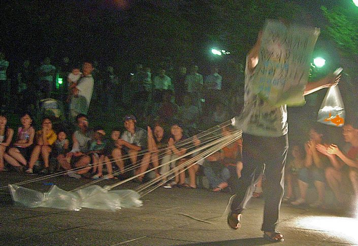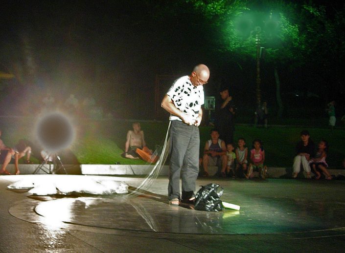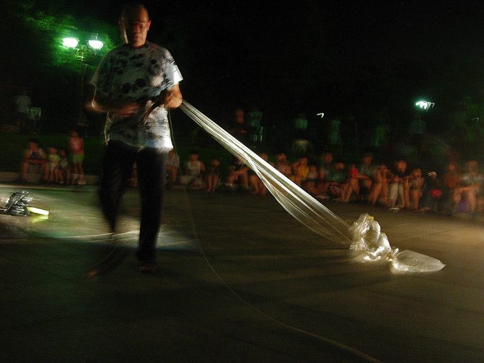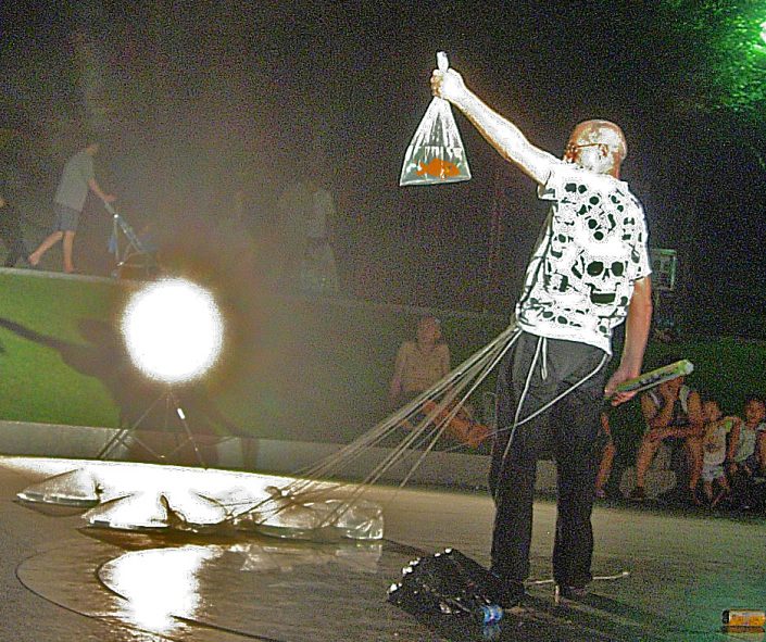 From the trash bag he pulls out a roll of paper that unfolds and shows the audience: "90% of the fishing was exhausted last century", while showing a tenth bag of water in which there is a live fish.