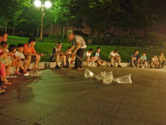 Circulates them by the spectators at equal distance. Take out a belt where the rope picks up by the midpoints between the bags. He puts on the belt from which the strings that pull the bags come out.