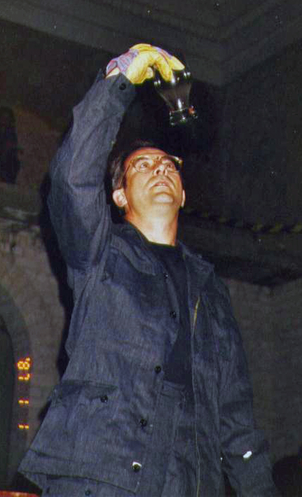 Now the performer tries to reconstruct the shape of the glass, when he gets it he shows it to the audience with his arm raised.