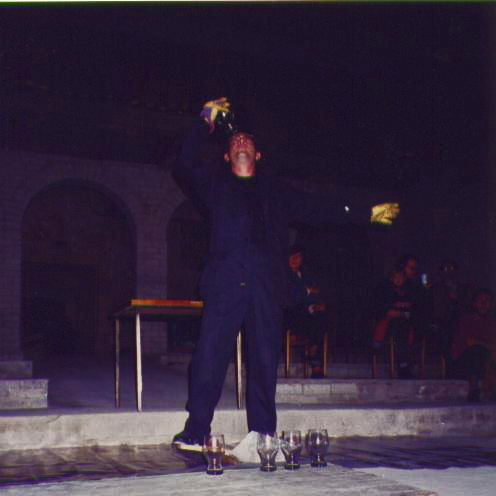 The performer takes a shovel and a table with five glasses on it. Place the shovel on a large plastic on the floor in front of the row of spectators, on the shovel the table and above him trying to stay in balance. He takes a glass over his eye. The glass is broken. Repeat this action on the nose, tongue, ear and hand.