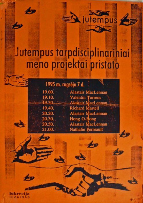 The performer has placed on the floor a slide projector that illuminates him creating a huge shadow on one of the walls.