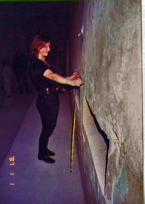 The performer turns on the projector again but this time with a slide with two lines of light on the floor.