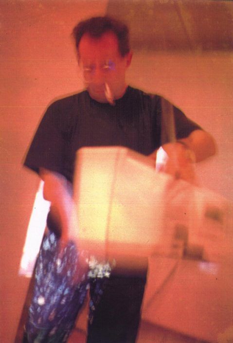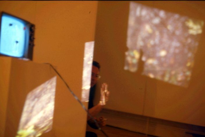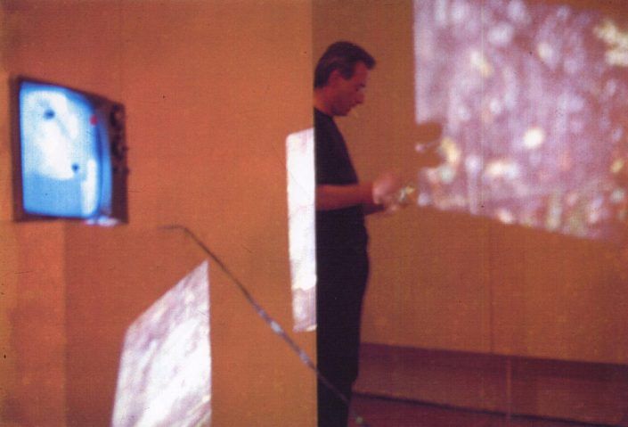 Then he lits the slide projector, that sets on his shoes; the light beam just “touch” one TV screen. The performer out of the beam, smoking a cigarette, pronounces the sound of the vowels expelling in the light beam different shapes of smoke.