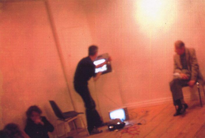 The performer is carrying a plugged slide projector. Images of his walk by the town are projected on the ceiling, floor, walls and audience. He sets on a TV, daily news is the program. He places the projector in front of the TV, enlightening the screen of the TV.