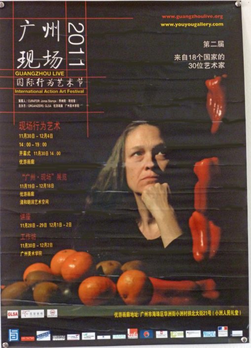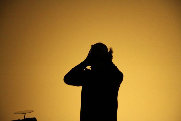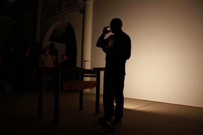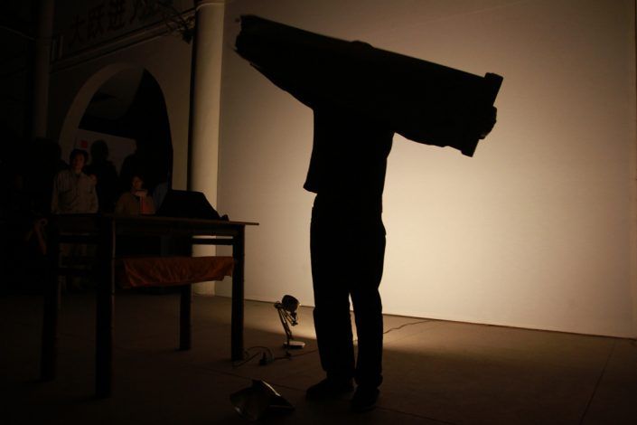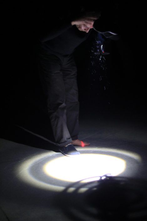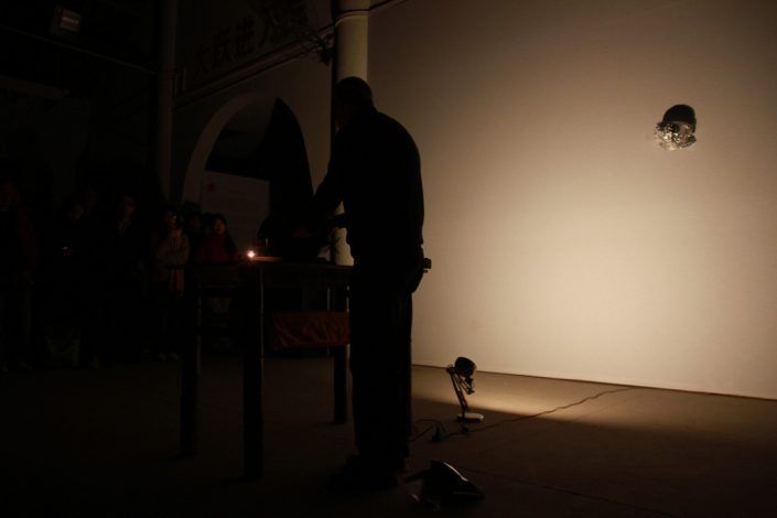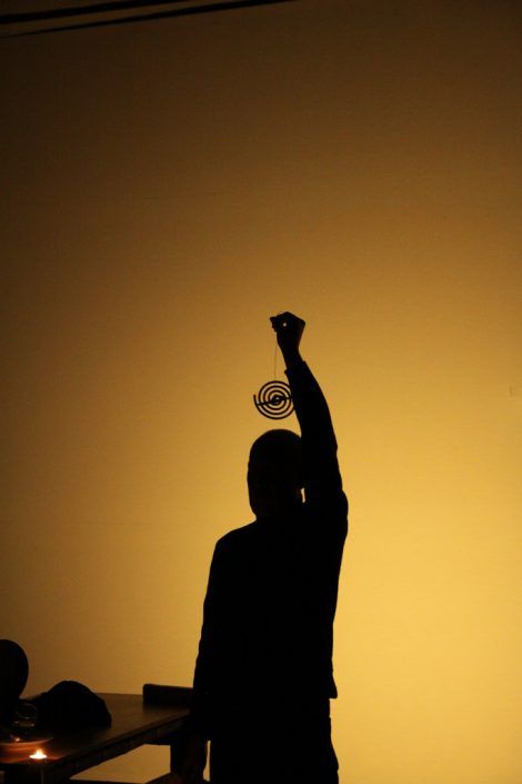 The performer is located in front of the projector cannon with the DVD of “snow” , on