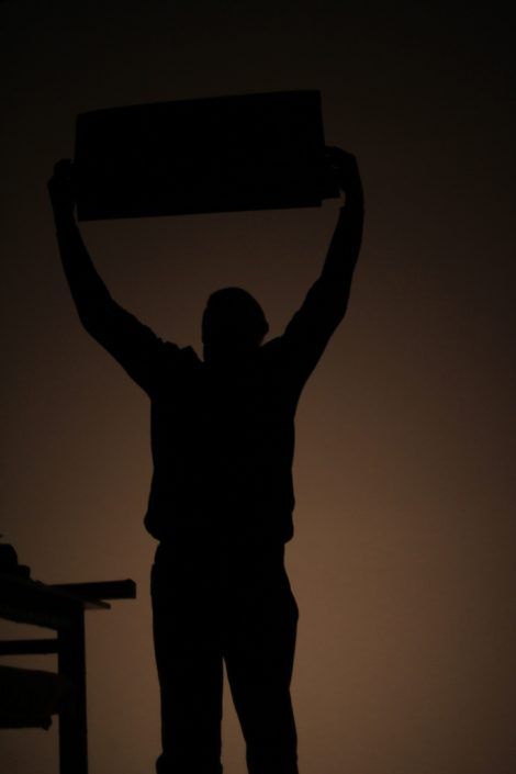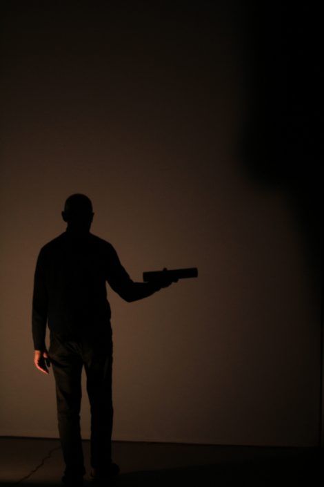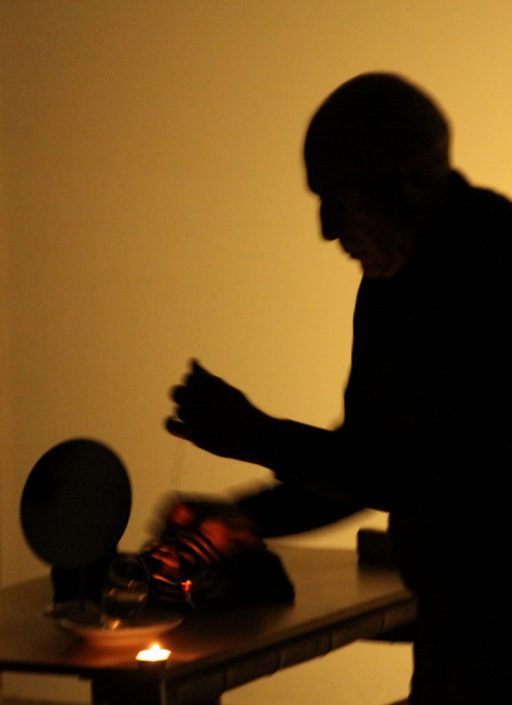 He removes the figure of cards from his arm, he turns the figure of cards slowly, appearing and disappearing as the light receives.