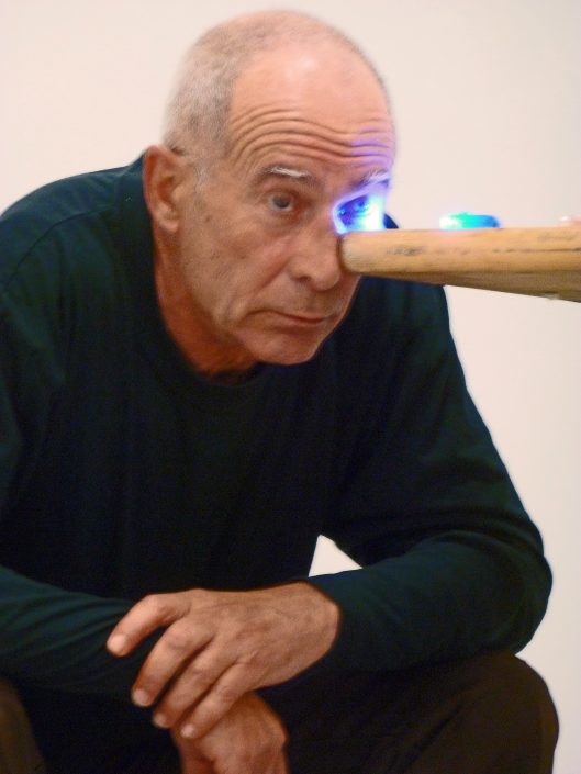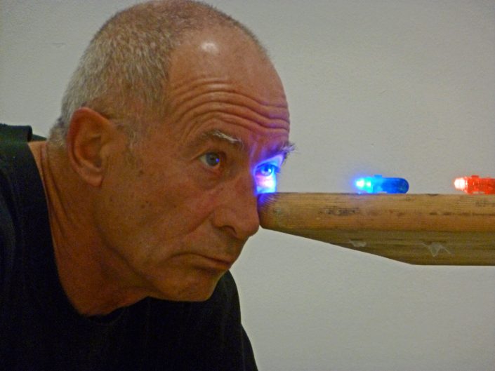 When the audience enters, there is a series of tables joined in a row. On the far left is the performer sitting in a small chair with his eye resting on one of the corners. On the table there are several boxes of matches. Several colored led lights, which the performer uses to light his eye, color changes over the minutes, without further action