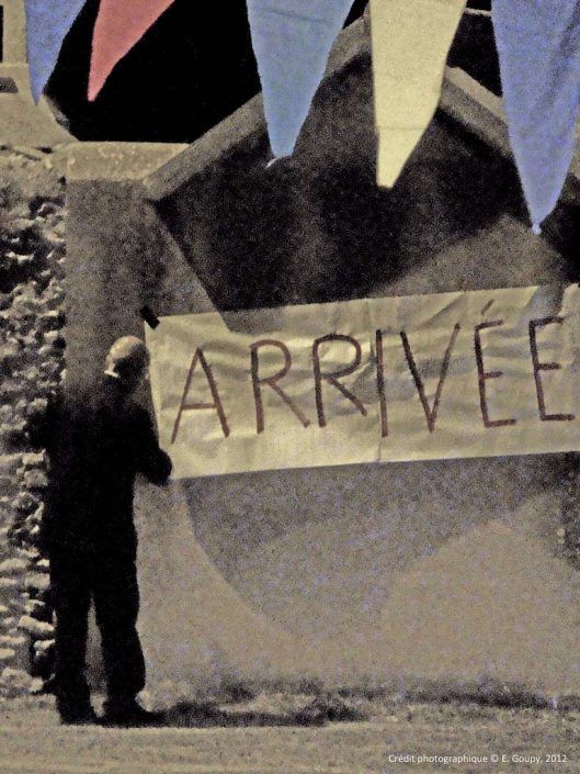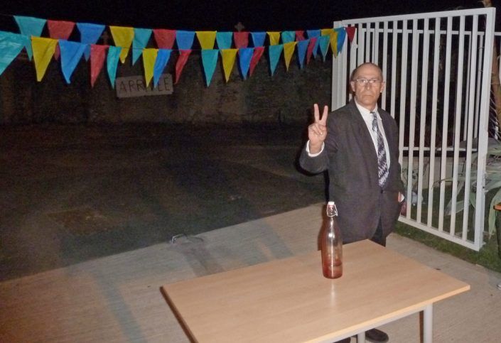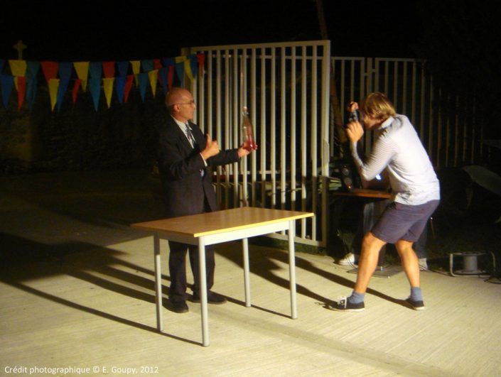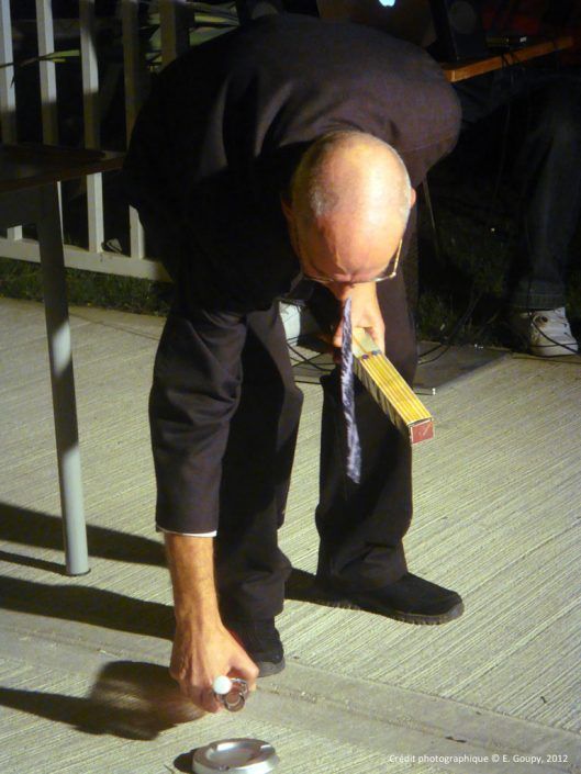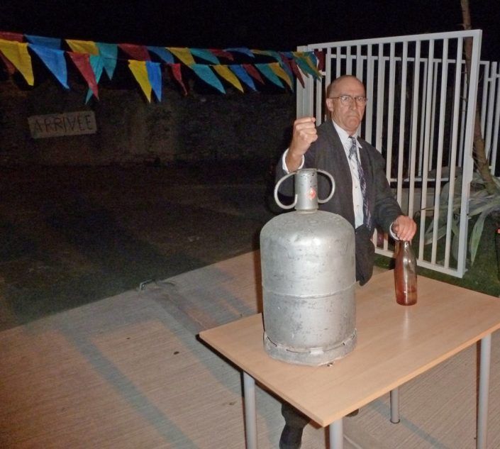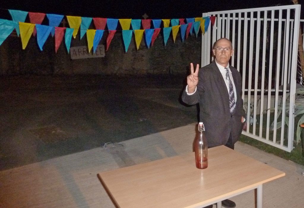 He retires observing where the gas bottle has gone: under the arrival sign next to the rubbish bin "Libia 2011"; brings the bottle rolling to the position of the public and leaves it standing on the ground.