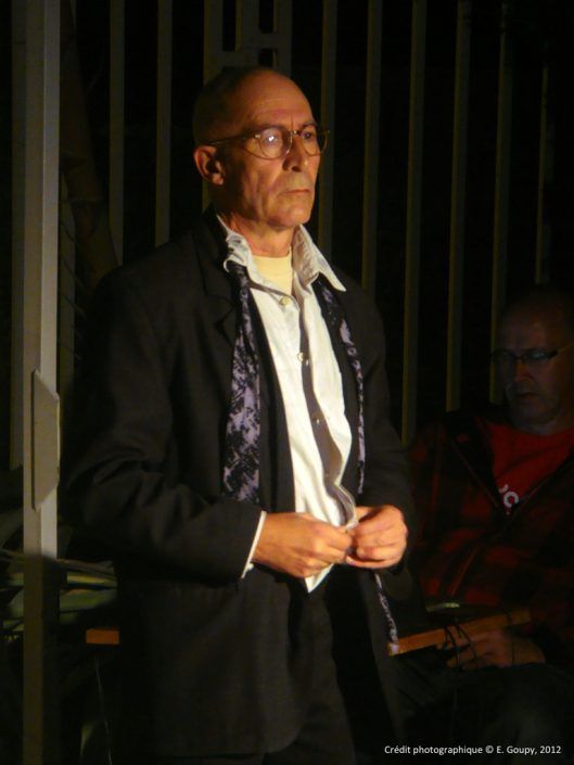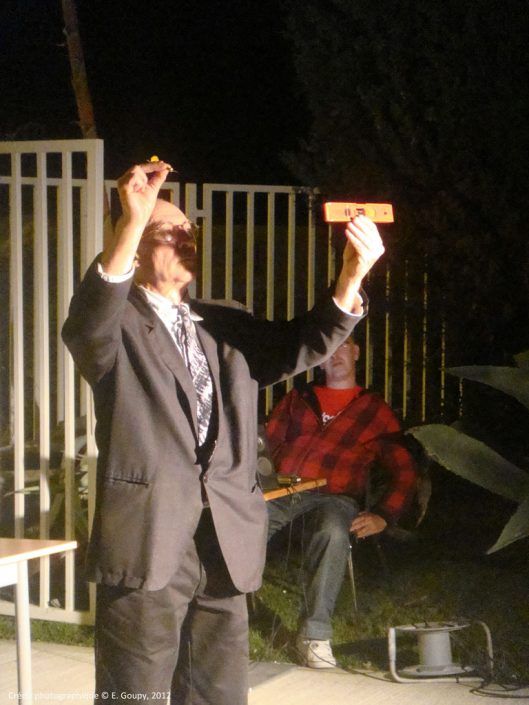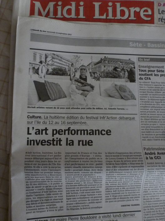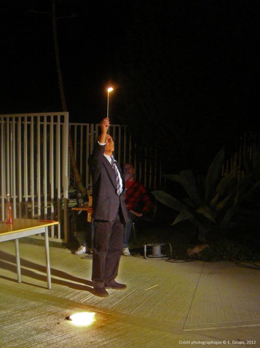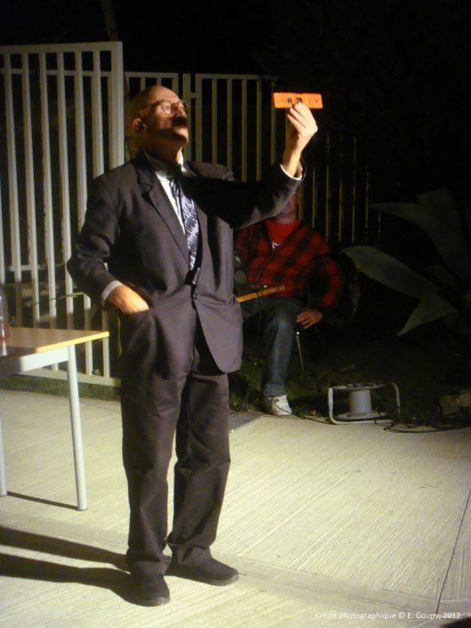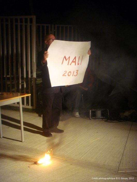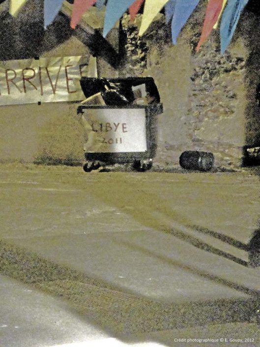 The performer places a container of garbage near the arrival poster, rotates at the last moment showing a poster attached where he puts LIBYA 2011