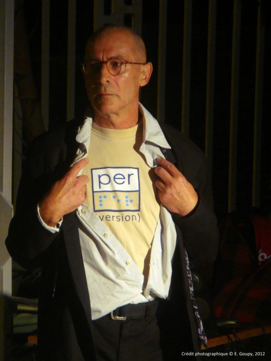 The performer removes his tie and opening his shirt shows his T-shirt that has the word PERVERSIÓN printed.