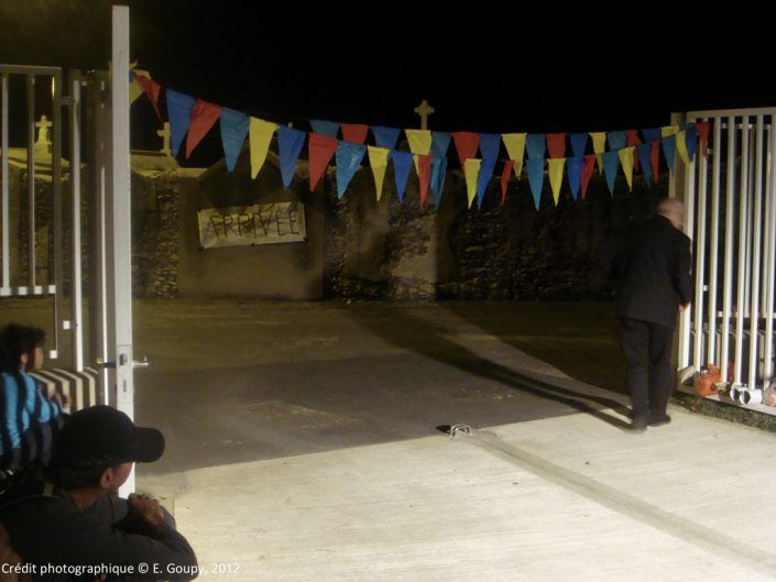 Place on the wall of the cemetery an elongated poster that says ARRIVAL.