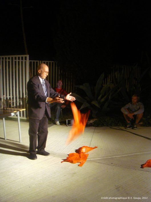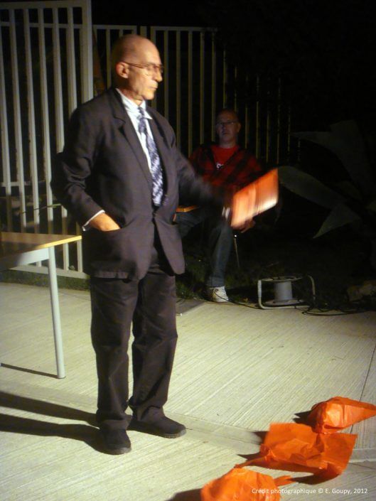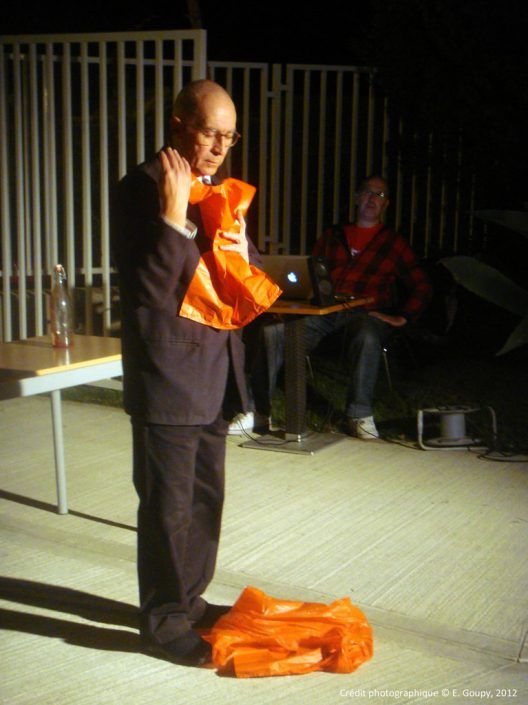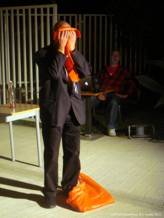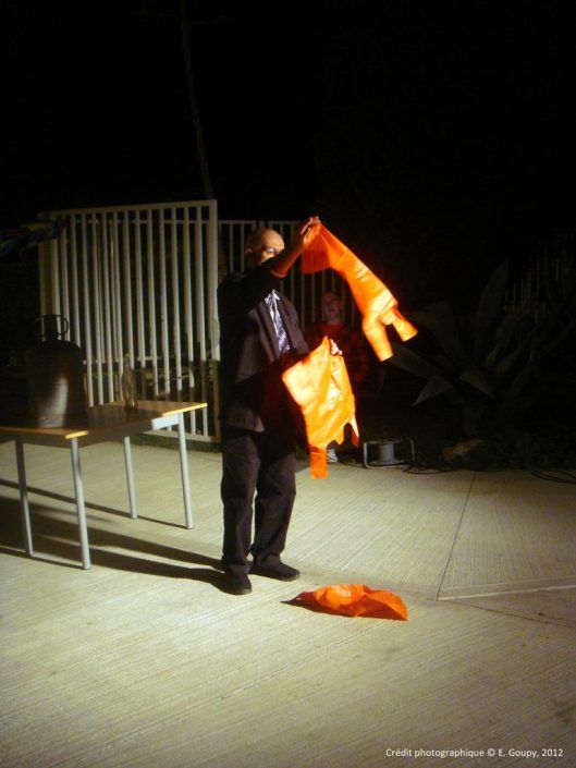 The performer removes red plastic bags and pronounces a different Libyan name. Take each bag and move it to fill with air and give life to a child figure with arms raised. He puts them on his head, he raises them, cradles them and hugs them. After each movement they let them fall defenseless to the ground.
