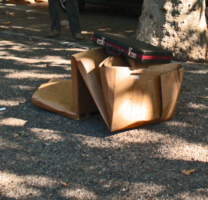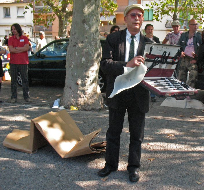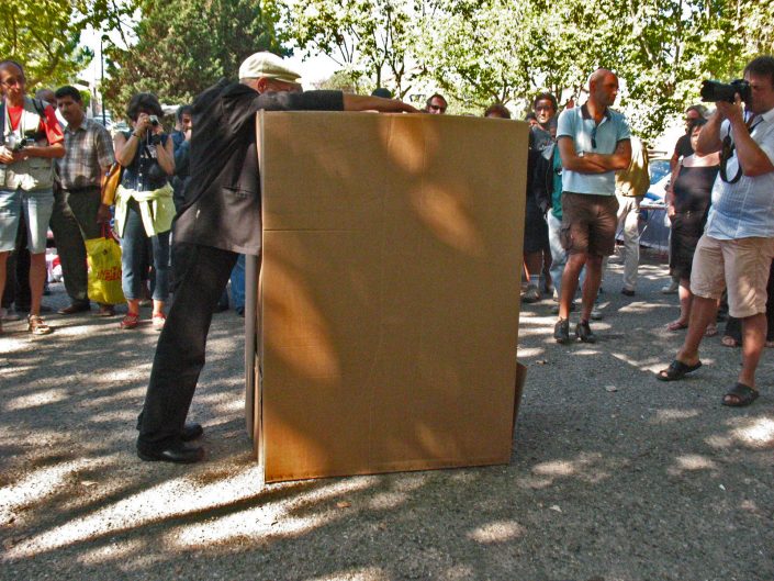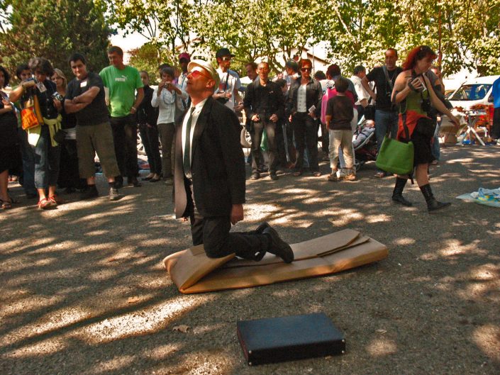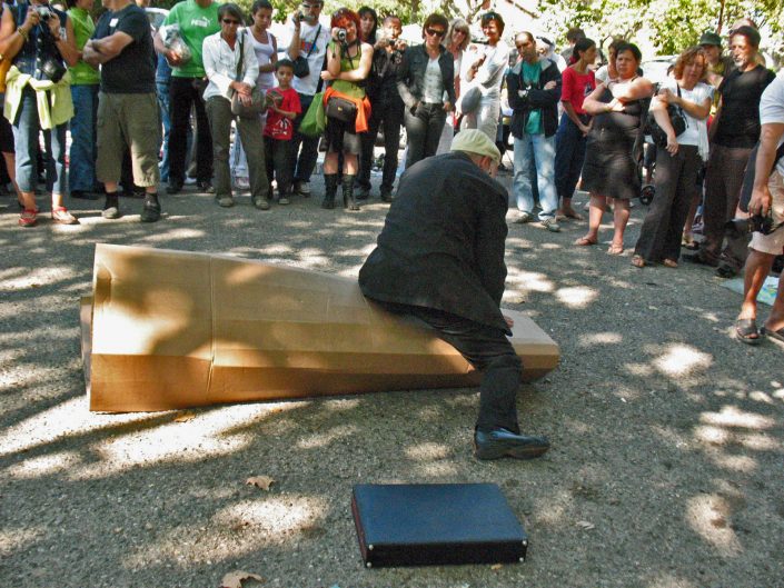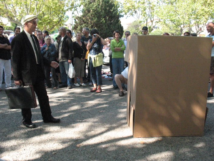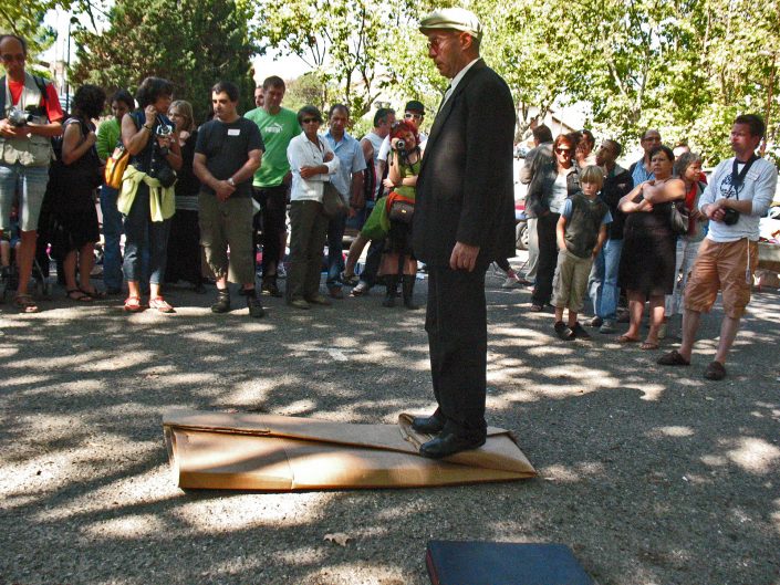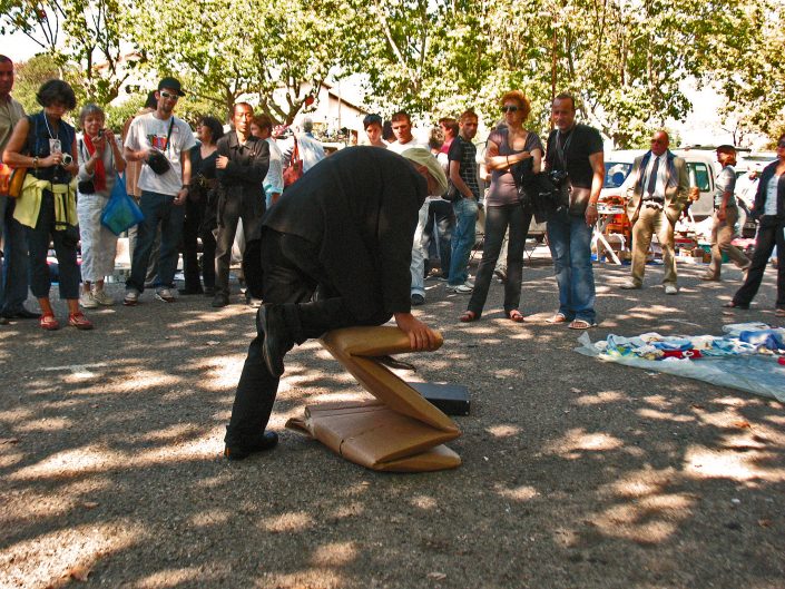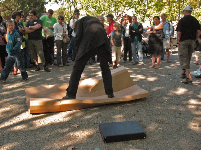 The performer dressed in a suit and tie stands in front of a large cardboard box, on top of which he places the executive suitcase he was carrying, after a few moments, he rushes forward on the box that he flattens with his body in the fall.