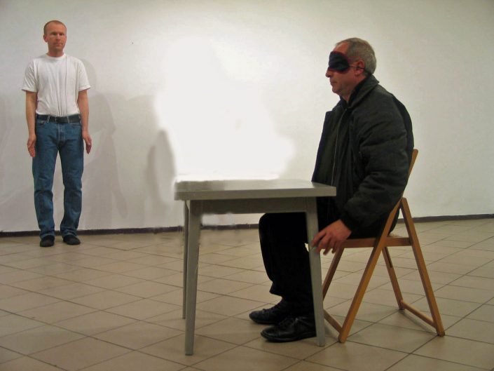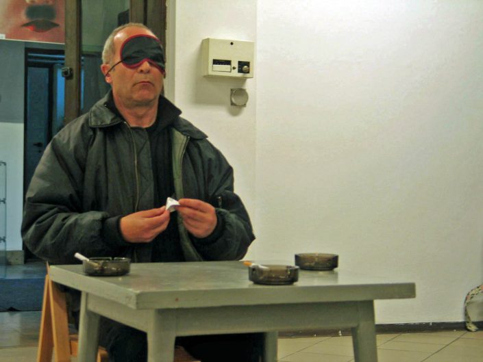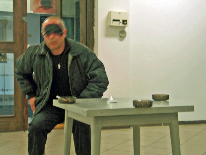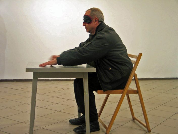 The performer enters the door wearing a mask over his eyes, which makes it impossible to see.
