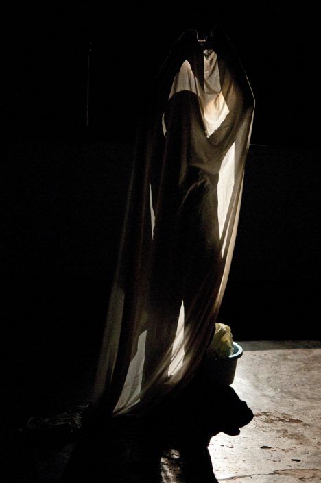 Walking sheet: the performer dressed in black, feet and hands, head included, with a sheet in one hand and a bucket in the other