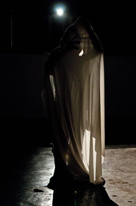 The people of the audience sit down when the performer, standing still, is covered with a white sheet