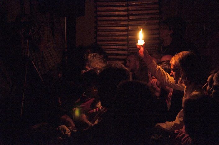 Light a thick wick candle, one hand covering the light that illuminates the figure of the performer.