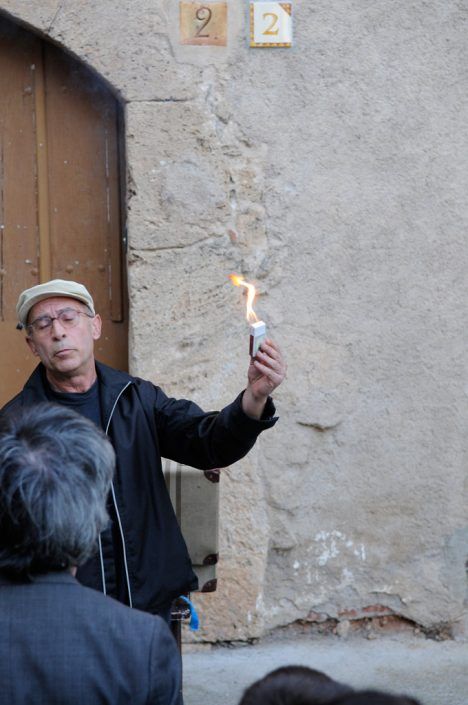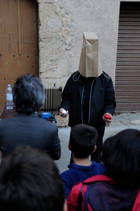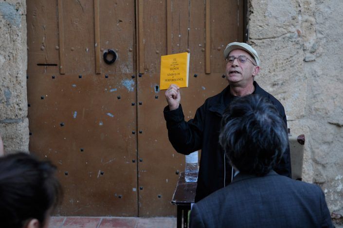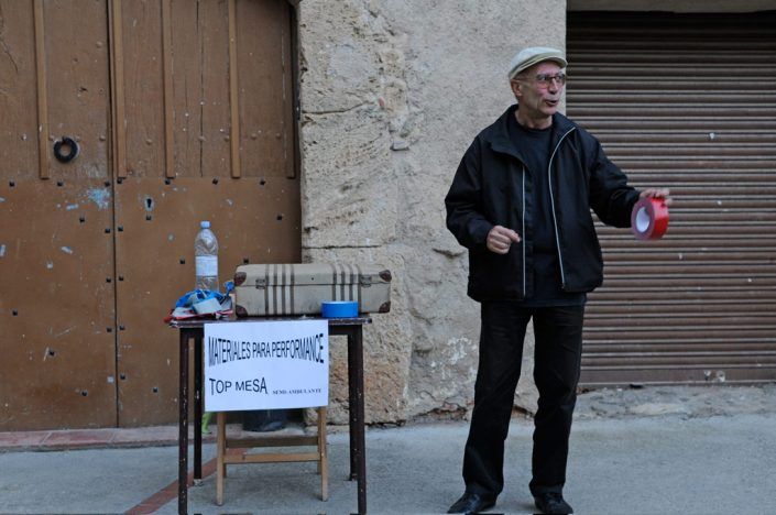 The performer, a street vendor of performance materials, presents a critical parody of the clichés that surround the world of performance