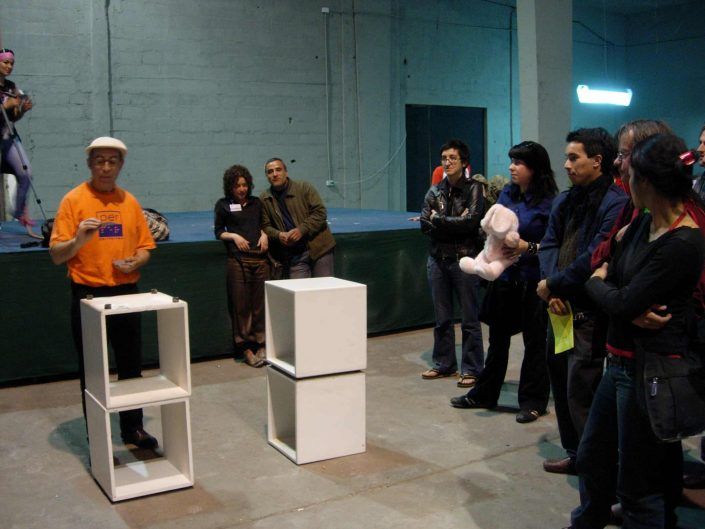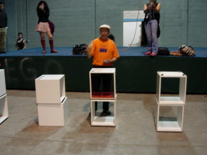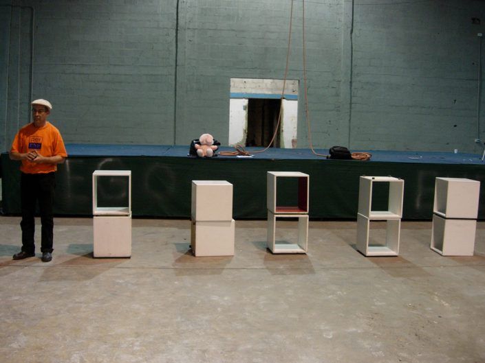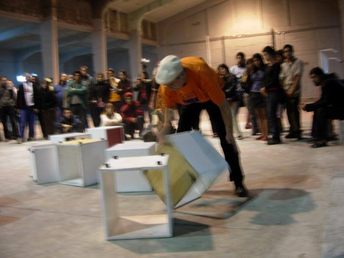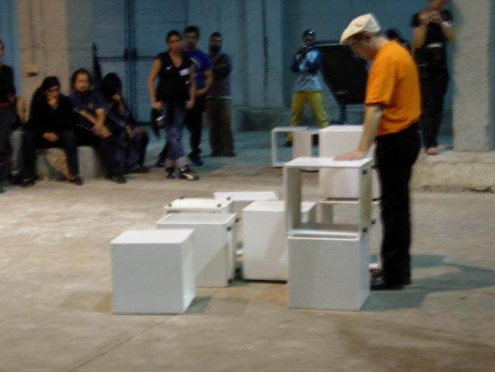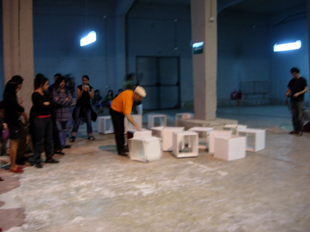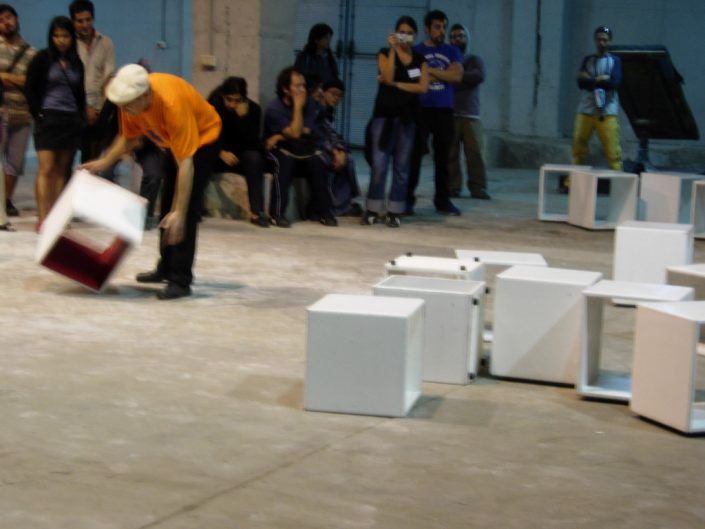 The performer soundly displaces ten empty cubic modules to form 5 pedestals.