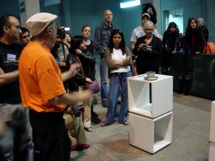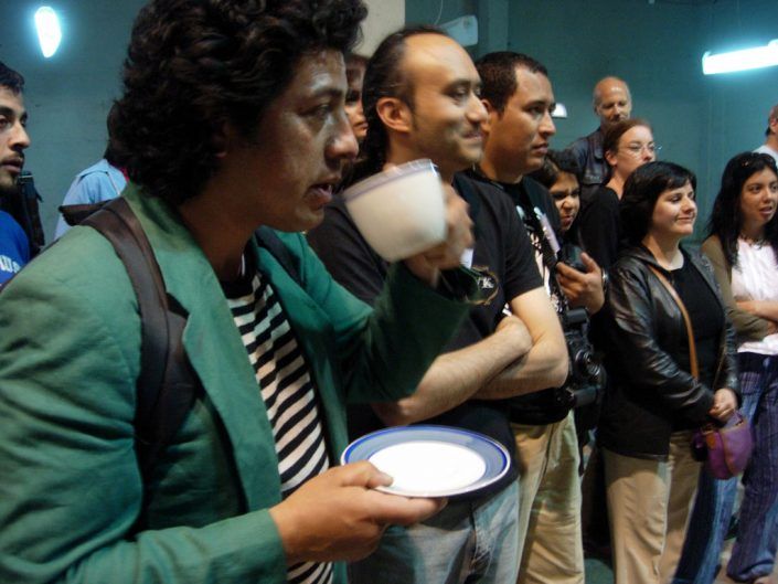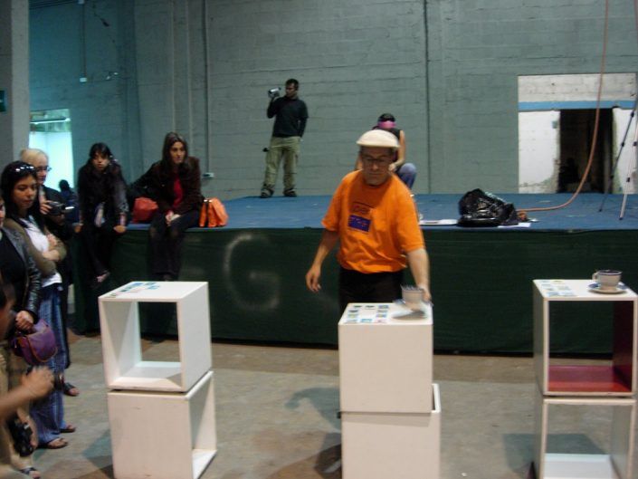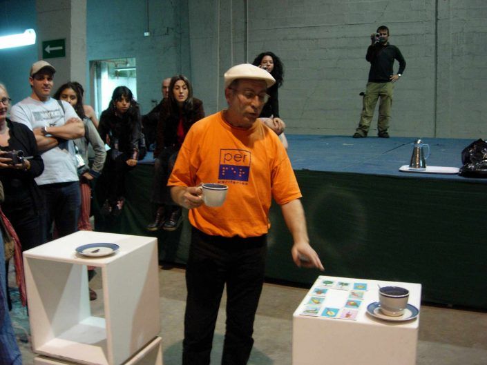 After that, the performer, syncopated, pour each cup on each table leaving a different splash with the coffee scraps.