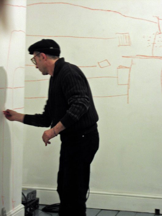 The performer will draw on the wall the shape of the objects copying from the projected image.