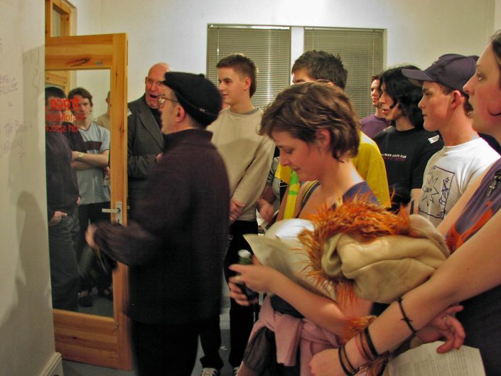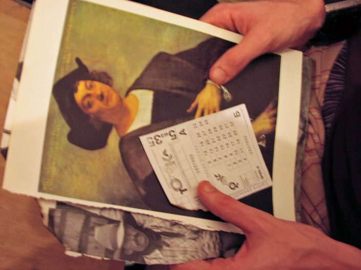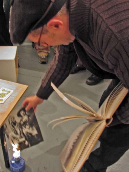 The performer takes some polaroid pictures of the attendees and sticks them on the entrance glass.