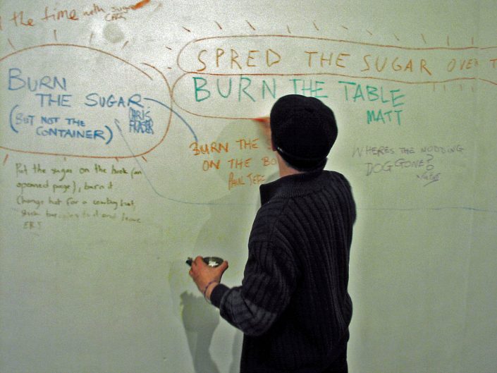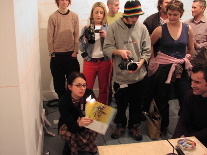 Chance determined to distribute pages of books in flames, burned labels, sugar ...
