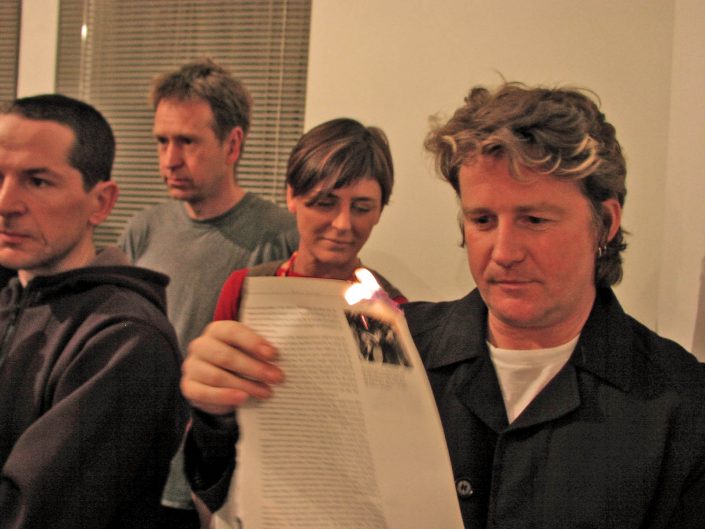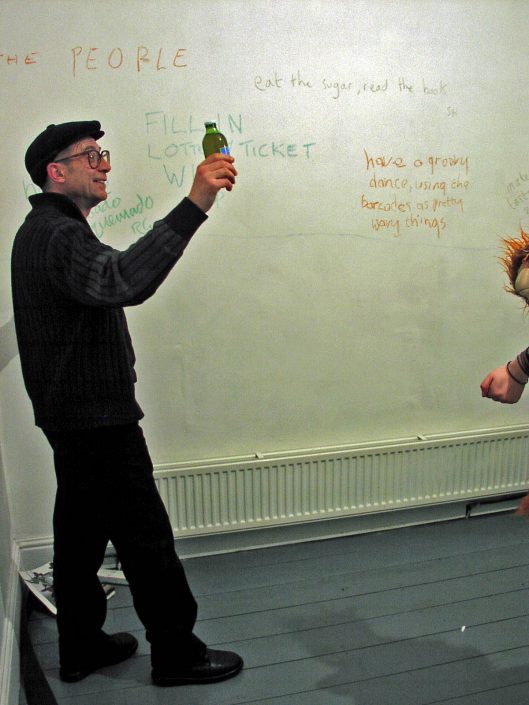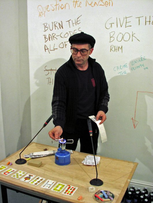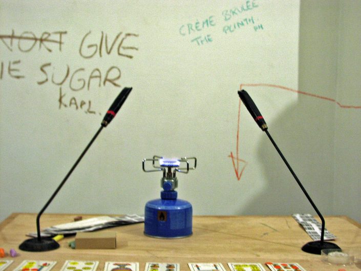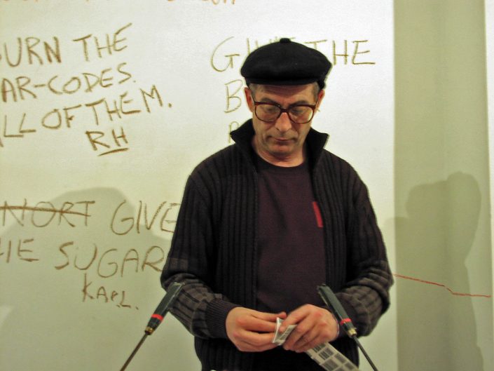 The performer takes a pedestal and writes "past", "present", "future" on the sides of the parallelogram; Supports it in the ground on a corner making it turn, and shows the face fall, in that occasion: "Past"