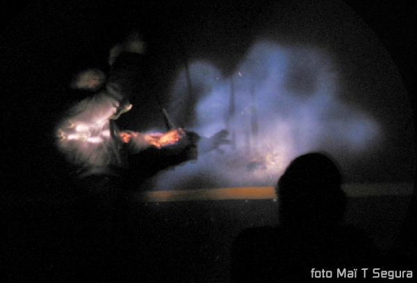 The performer approaches the backpack and turns off the flashlight. He opens the door and his figure appears in backlight, raising his hand slowly.